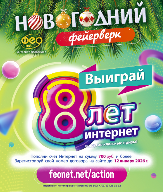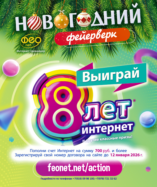 Компания «ФЕОНЕТ» разыгрывает 8 лет бесплатного Интернета (подарочные сертификаты на 6 месяцев - 6 шт., на 3 месяца - 12 шт., на 1 месяц - 27 шт., итого 99 месяцев бесплатного Интернета или 8 лет), высокоскоростные роутеры, IPTV-приставки и другие ценные призы от компании в новогодней акции «Новогодний фейерверк 2026!»!